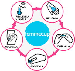 Como se muestra en la imagen es una copa menstrual hecha de silicón suave de grado médico e hipoalergénico que se coloca internamente como los tampones, la única diferencia es que esta recolecta el flujo menstrual en lugar de absorberlo. Estas copas son reutilizables y tienen una vida útil de 5 años o más según el cuidado que tengas con ella. En comparación con los tampones o toallas sanitarias, Femmecup® tiene muchas más ventajas ya que es más ecológica, saludable, rentable y cómoda.